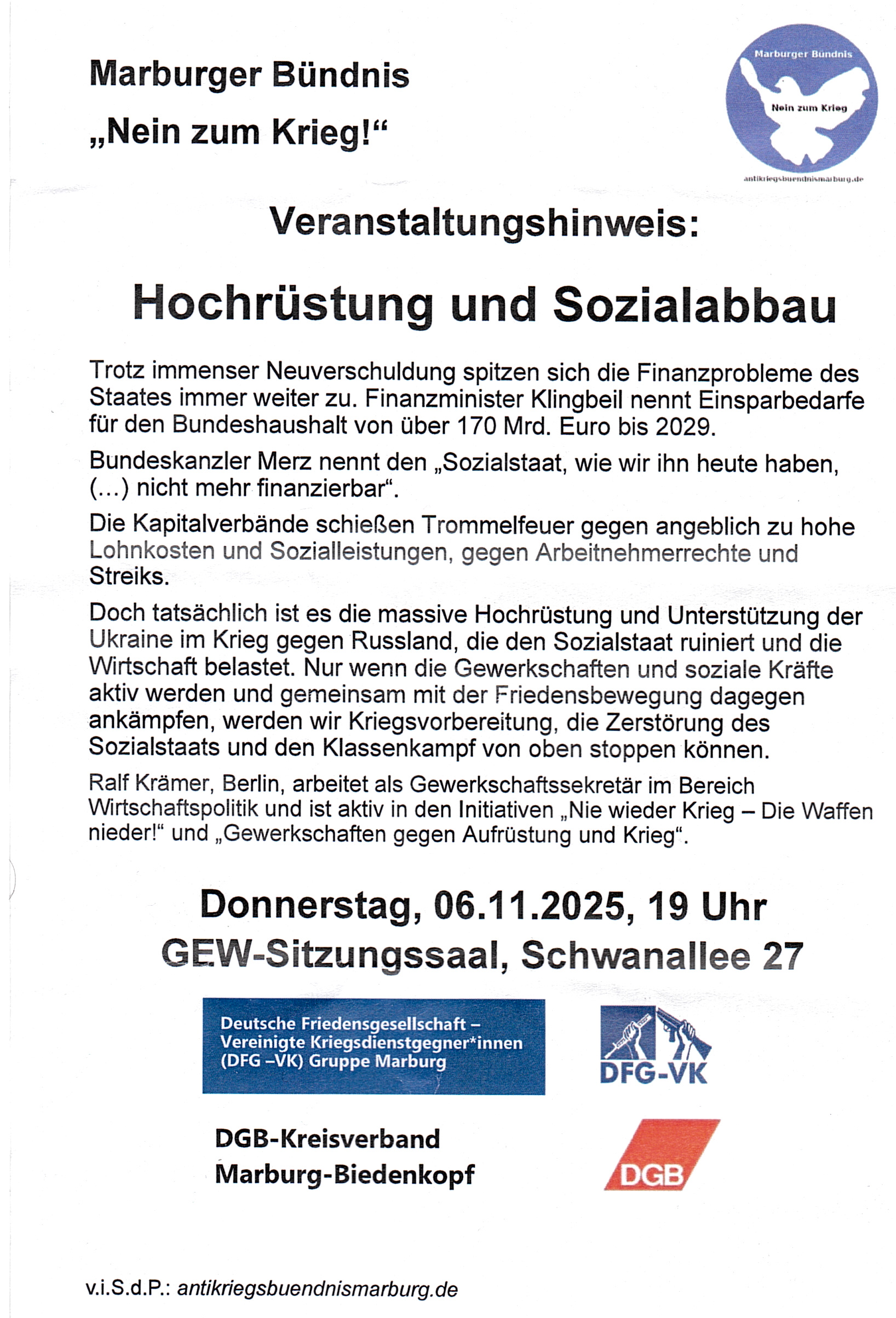 Marburger Bündnis „Nein zum Krieg!“ Marburg, 25.08.2025