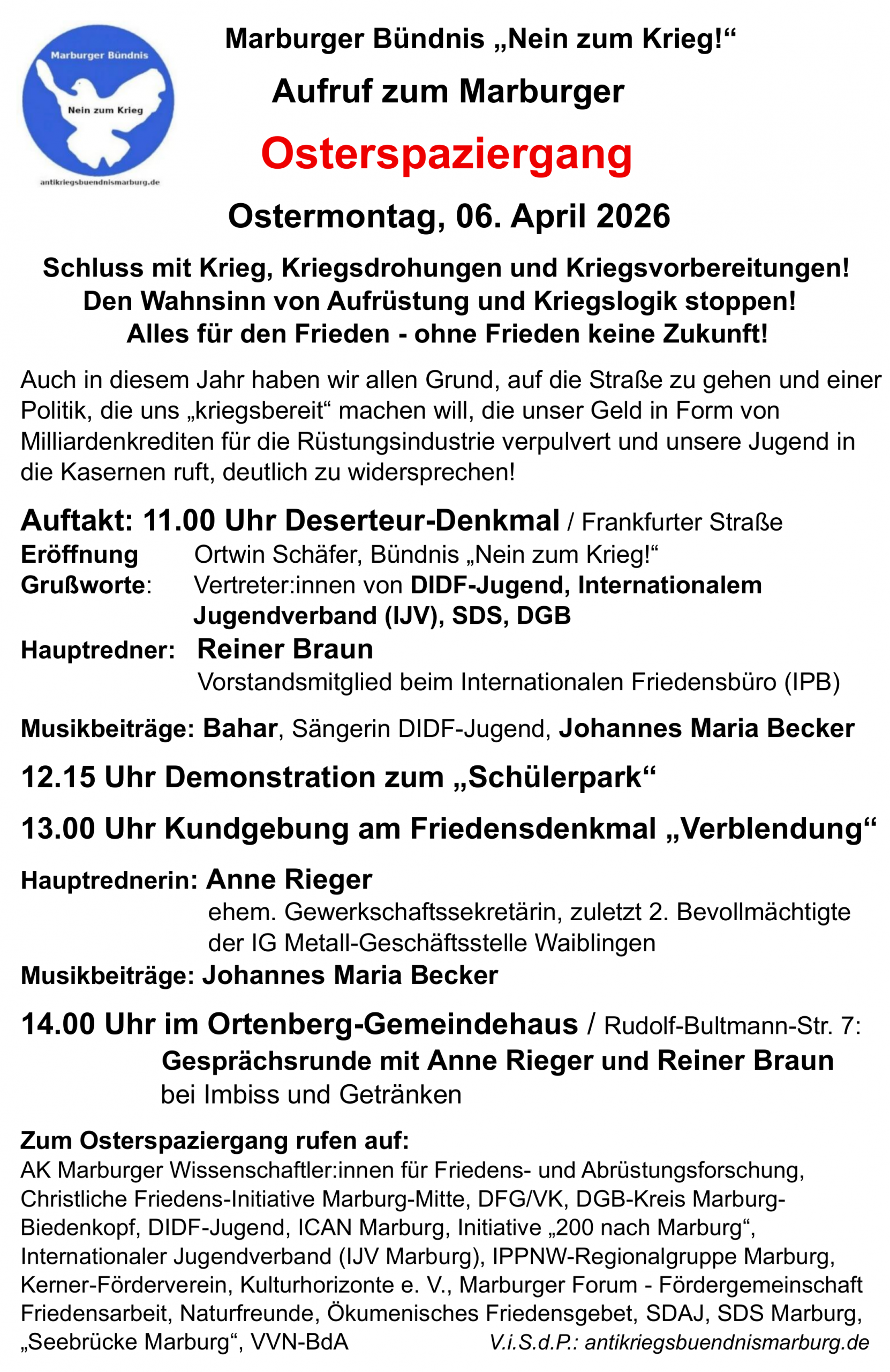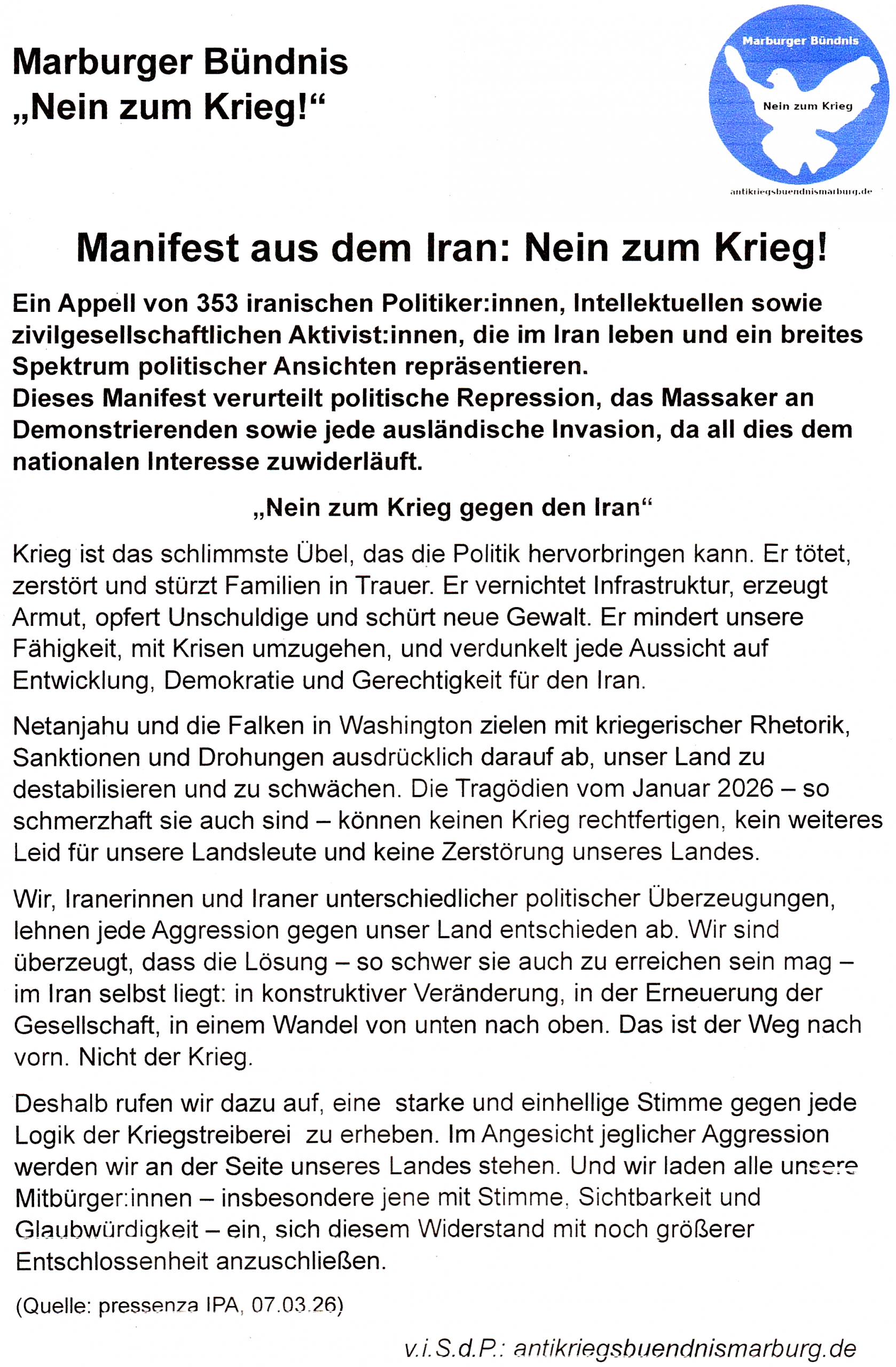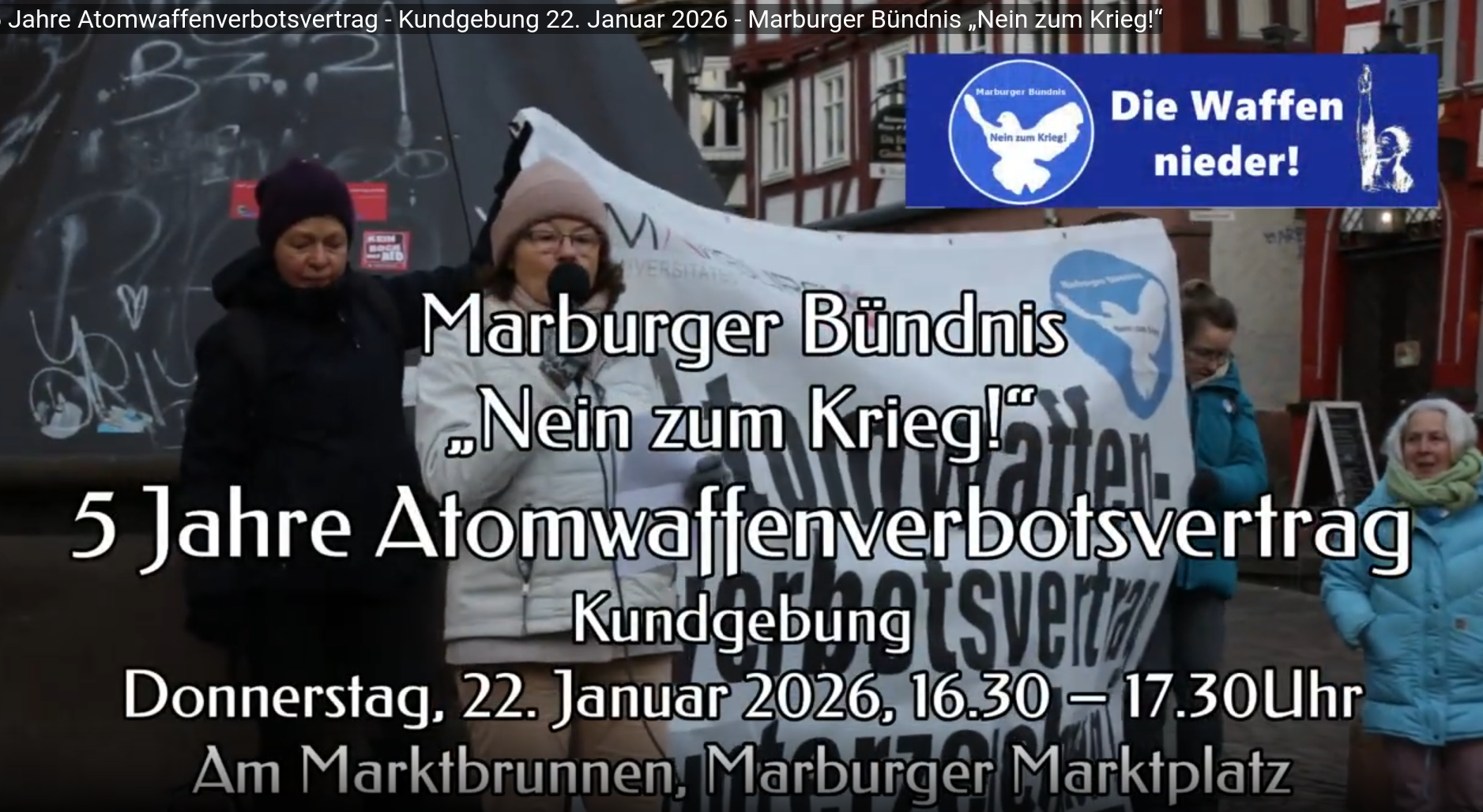 Am Donnerstag 22.01.2026 von 16:30 Uhr – 17:30 Uhr informiert das Marburger Bündnis „Nein zum Krieg!“ am Marburger Marktbrunnen in der Oberstadt über die Bedeutung und Tragweite des Atomwaffenverbotsvertrags und über die sinnvollen Forderungen dem Vertrag beizutreten.