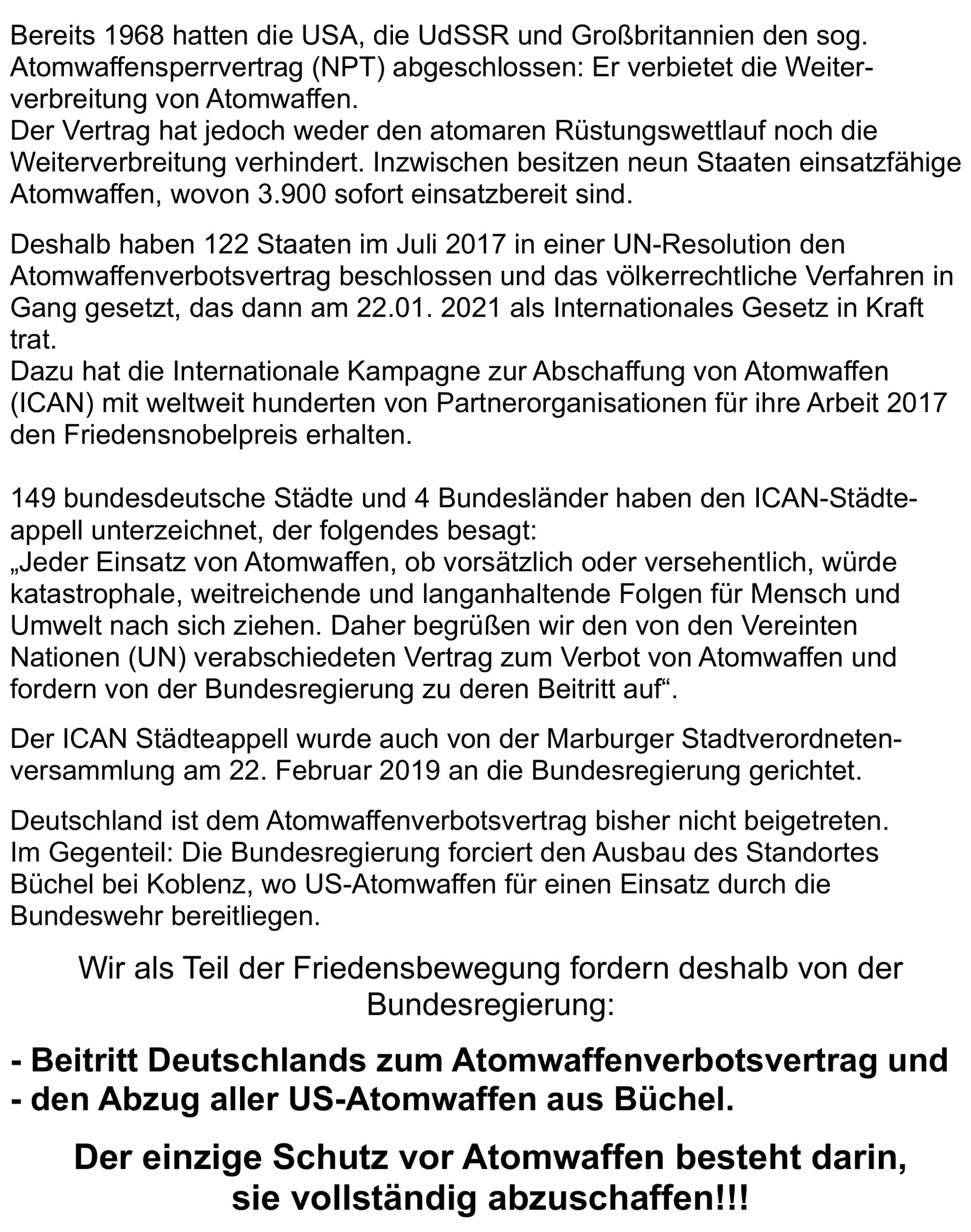 Der ICAN-Städteappell wurde auch von der Marburger Stadtverordnetenversammlung am 22. Februar 2019 an die Bundesregierung gerichtet. Im Gegenteil: die Bundesregierung forciert den Ausbau des Standortes Büchl bei Koblenz wo US-Atomwaffen für den Einsatz durch die Bundeswehr bereitliegen.