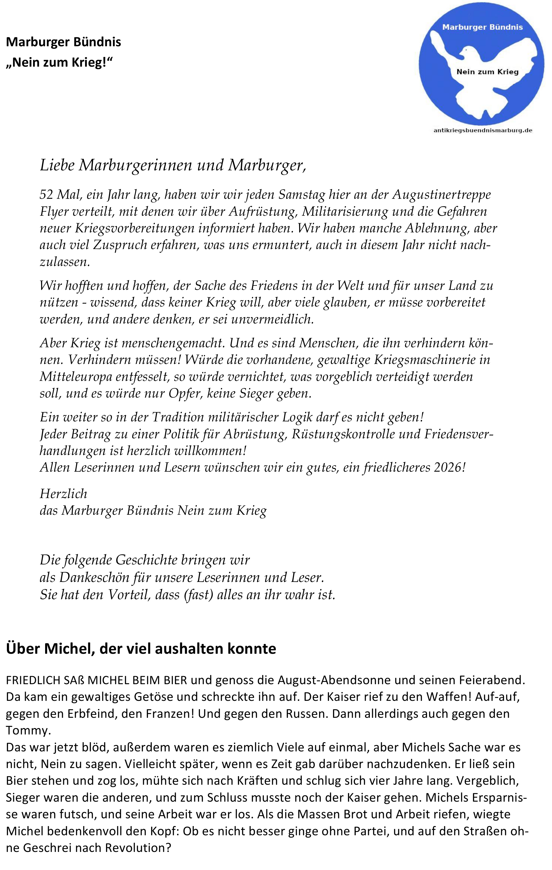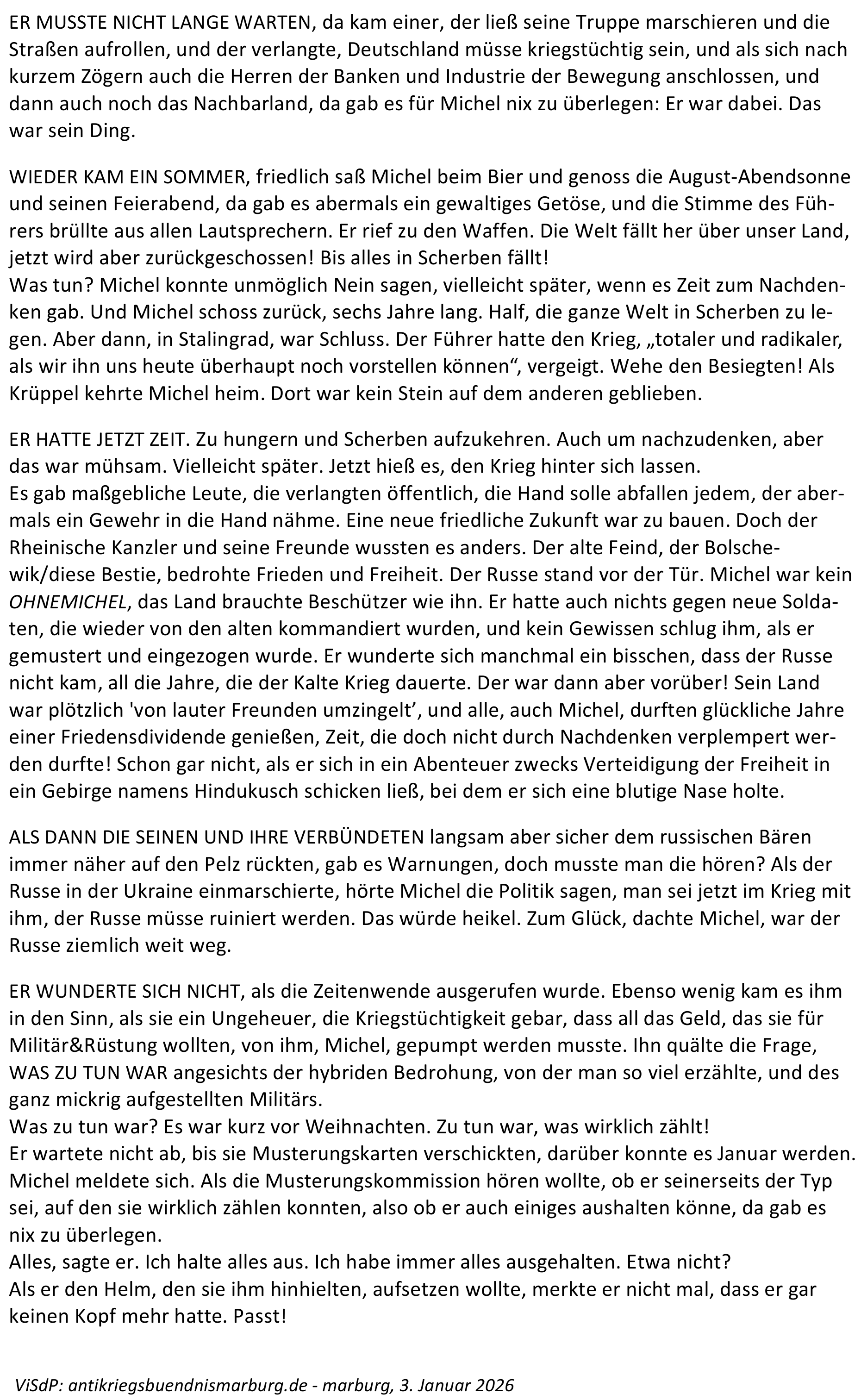 Michel 2026 Veröffentlicht am Januar 3, 2026 von antikriegsbuendnis-marburg Michel 2026 Marburger Bündnis (Flyer)